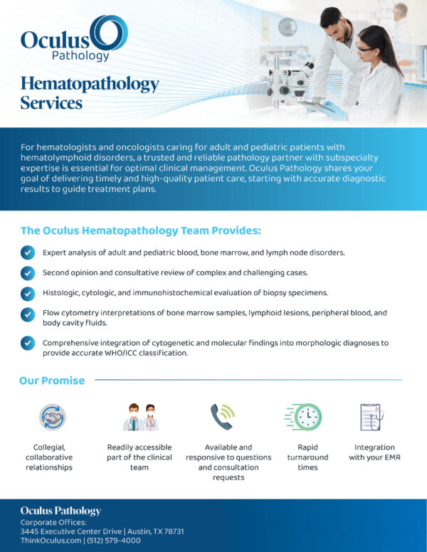 Oculus Pathology offers a broad range of diagnostic and interpretive expertise in the practice of hematopathology. We staff regional hospitals and outpatient reference laboratories with ten board-certified hematopathologists who have experience in both adult and pediatric diseases of the blood, marrow, spleen, thymus, lymph nodes, and other solid lymphoid tissue.